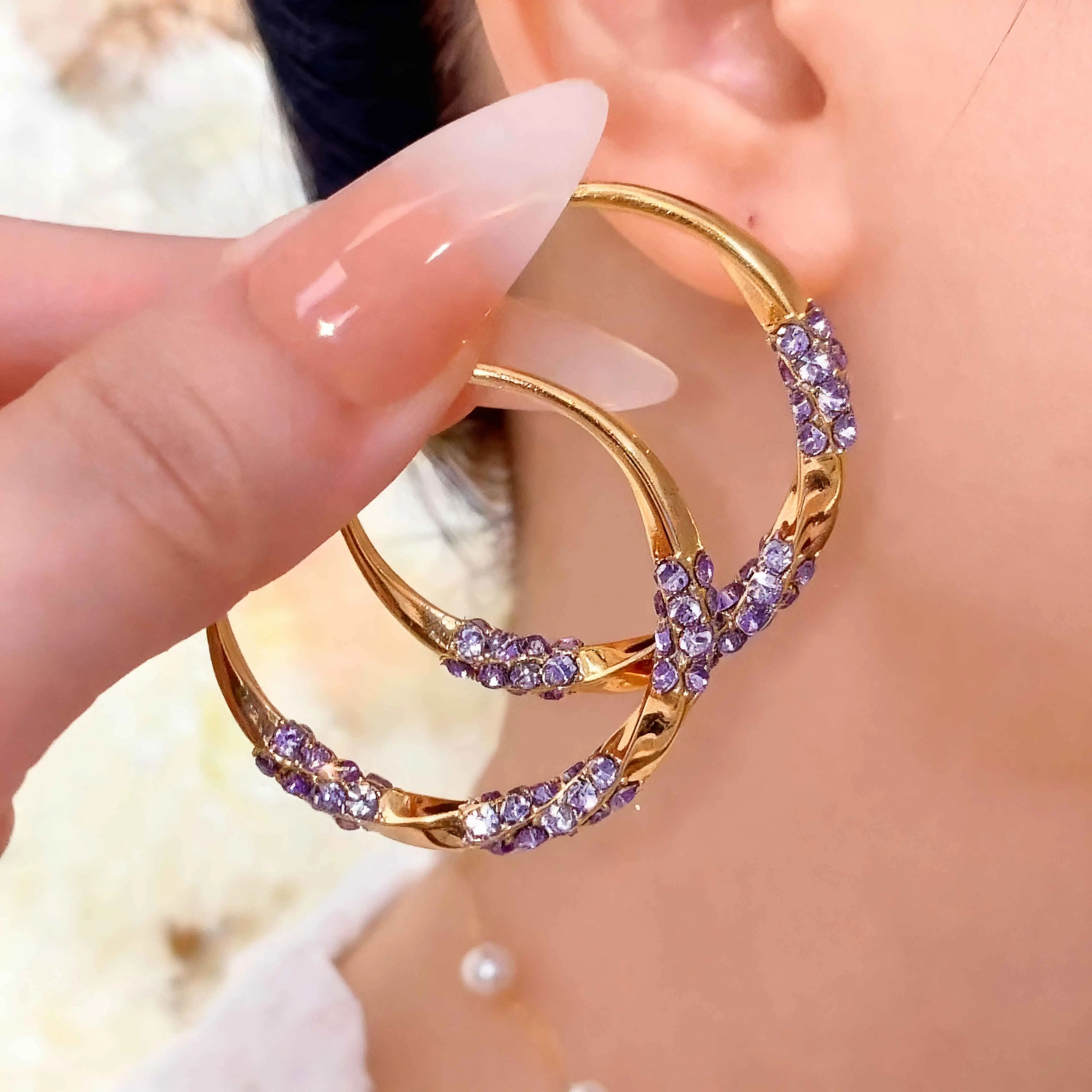 Premium Earrings- ইউরোপিয়ান স্টাইলের চকচকে পার্পল রাইনস্টোন হুপ ইয়ারিং